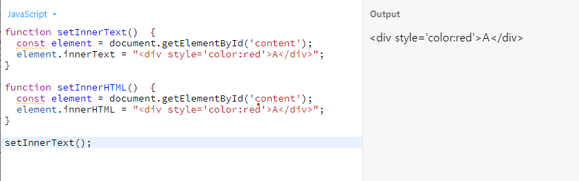 innerHTML은 문자 그대로 HTML로 받아 들인다. 그렇기 때문에 서식이 적용된 것을 알 수 있다.